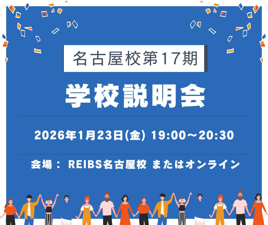 REIBS名古屋校が大幅リニューアル!受講生の皆様のご要望にお応えして、期間短く!価格安く!受講内容充実!いたしました。2月より開講いたします。説明会は無料で参加していただけます。ぜひご参加ください。